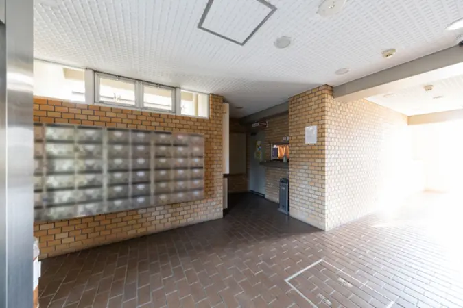 建物は中規模クラスのマンションで、住戸配置や共用部は実用性を重視した構成となっています。派手な共用施設はありませんが、その分管理が行き届きやすく、共用部分は比較的すっきりとした印象です。エントランス周りもシンプルで、住まいとしての安心感を重視した造りが感じられます。